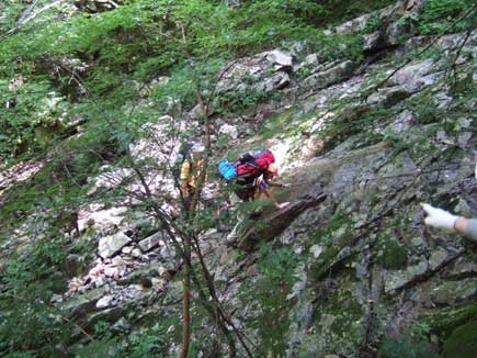 狼平まで川を遡行します。テープ、ペンキマークを辿りますが、手足が届かなかったり、水量により渡渉出来なかったり、極端に岩が滑ったりします。