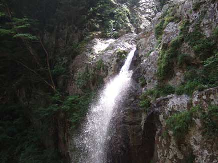 一の滝で昼食です。真夏の太陽をいっぱい受けて滝はクリスタルを散りばめたように止めどなく空から落ちて来ます。冷気をふんだんに振りまいて下界の連日の酷暑をしばし忘れる別世界です。気温が低いため岩肌にはまだツツジが咲いて赤い色を添え、ウツギの白い花も見られます。