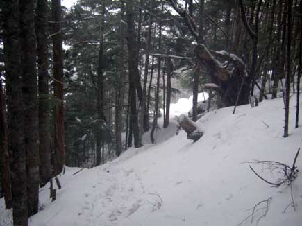 今日は橋には雪が積もっていますが欄干は全部見えている状態で「行ける!行ける!」と先輩諸氏、前回はこの欄干が全部雪で埋まっていてここから猛ラッセルで予定のテン場まで行けなかったそうです。