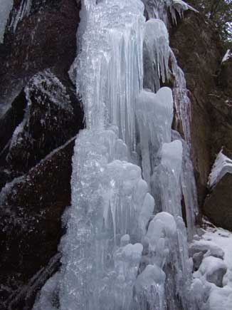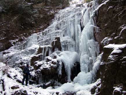 すぐ先にある似位の滝、二つの滝よりは小さく繊細。細く小さく飛び散って凍っている様はガラスを散りばめたようだ。