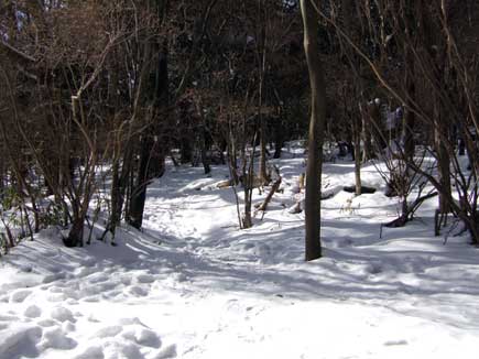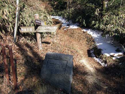 凌雲台を過ぎ、みよし観音を右に見て石切道を下る。陽の当たるところはすっかり雪が溶けているが蔭の部分では雪が残り下は氷になりその上に薄く雪が残って最も滑りやすい状態になっている。