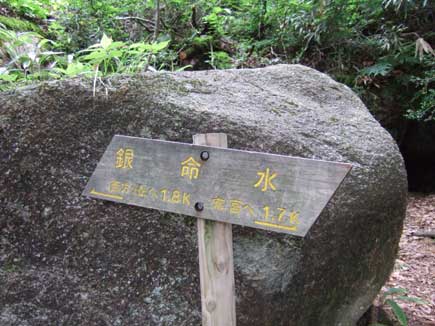 苔むす岩の間から水がわいている銀命水(海抜320m)