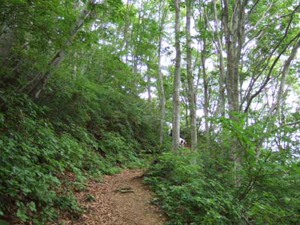 急に樹相が変わり明るい色になります。まぶしい緑のブナ林です。