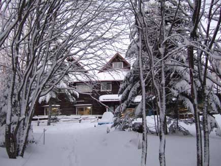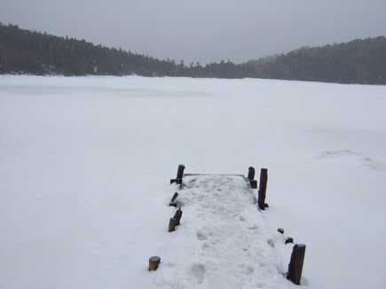 池をあるいて対岸の青苔荘へ、今日は山荘泊まりです。山荘前の湖面には水をとるために丸く氷を割って水汲場が作ってありました。(山荘にはそれに使う大きな鶴嘴があります)もちろん毎夜凍るのですが。