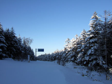 白駒池入口まで樹林の中を行き、雪付くR299を麦草峠まで歩きます。(R299は冬期通行止)