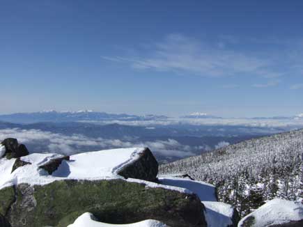 南アルプスの秀峰、白峰三山、鳳凰三山、中央アルプス、御岳、北アルプスが雪をのせ雲海を従えてピカピカです。アルプスの真っ只中にいるという実感ひしひしで身が引き締まる思いです。