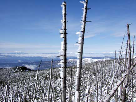 無数の縞枯の木にエビの尻尾です。遠景は御岳と北アルプス。