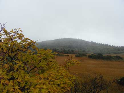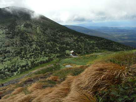 草原にお椀を伏せたような丸い田茂萢岳がガスに見え隠れしています。