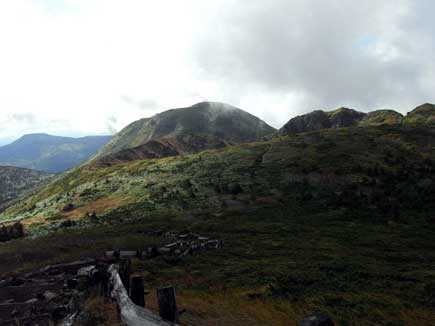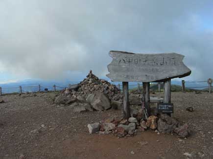 小屋前から大岳へ最後の上りです。山頂は広い台地状で明るく八甲田の峰々を始め東北の名山、北海道、青森湾、日本海と見えるはずなのですが、目線より下に線をひいたように黒雲が立ちこめて遠景は雲の中です。