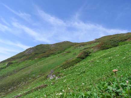 トカチフウロ(チシマフウロより色がうすい)エゾヒメクワガタなど次々に可愛い姿を見せてくれる花に誘われて、三峰山との稜線分岐に出ます。
