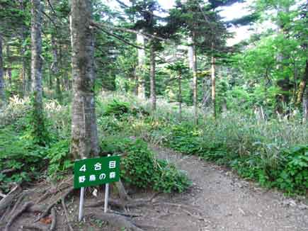 エゾマツ、トドマツの緑いっぱいの森に、コンコンと湧く名水甘露泉を過ぎて4合目は野鳥の森と掲げられています。