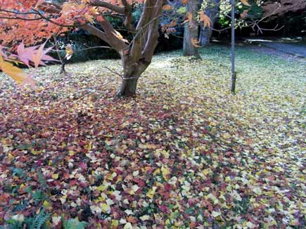 溝に吹き寄せられたモミジも鮮やかで紅の帯になっていました。