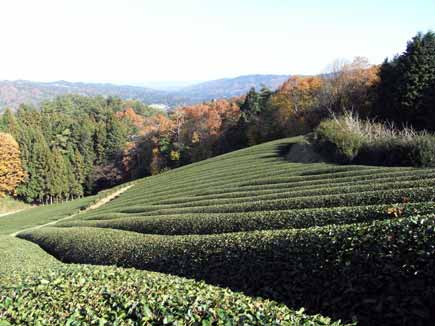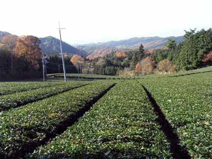 お茶畑の向こうは遅い紅葉、少しトーンを落としそれがよけいに山間の小さな集落風景を演出しているようです。
