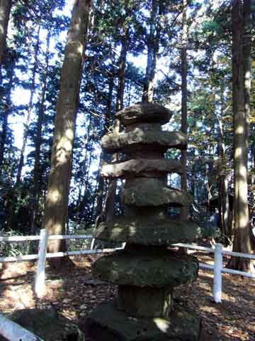 搭の森には珍しい六角の石塔があります。奈良時代のもので当初は六角十三重石塔だったそうですが、風化損傷が激しく現在は六重石塔になっています。台座、笠石全てが平面六角で奈良時代唯一の十三重石塔だったそうです。いっぱい欠けて少し傾いています。