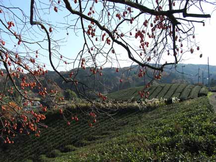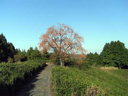 案内していただいた回り道の茶畑にあった大きな柿の木、いったいいくつ実をつけているのでしょう〜枝が枝垂れています。