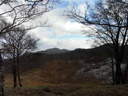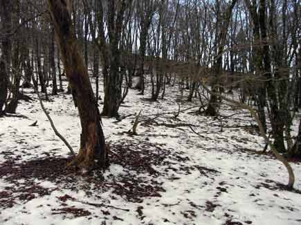 明神岳から桧塚へのブナ林、雪はほんのチョッピリ、それもここだけです。