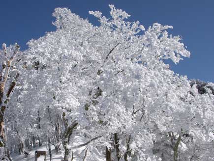 山上は真っ白の神秘の森、全てが白い。雪を載せて白しかないファンタジィーな世界、氷の世界、陶酔境に浸る。