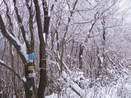 樹氷のトンネルをさらに進み一登りで白土山(980m)に着く。展望のないピーク、白い森。
