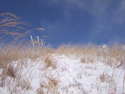 植林から自然林に変わると繊細な樹氷が見られる。鹿避けネットがずいぶん広範囲に張られいる。ここからネットに沿って進む。