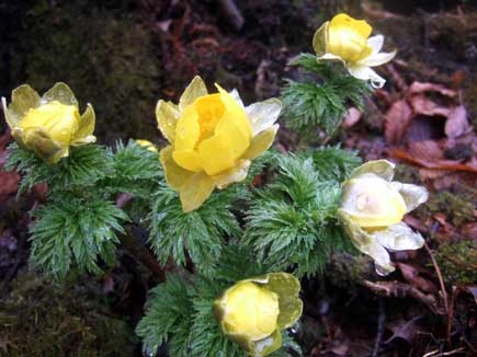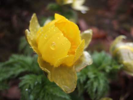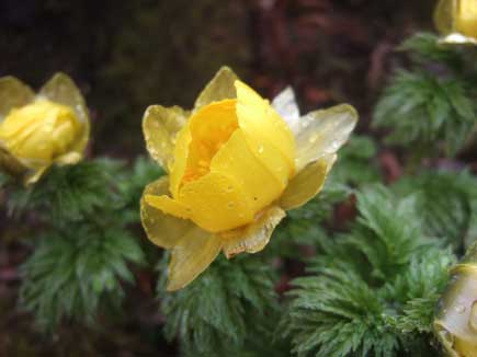 でもフクジュソウは元気いっぱい、健気に咲いて鮮やかな黄色がガスの中で少し明るさをかもし出す。