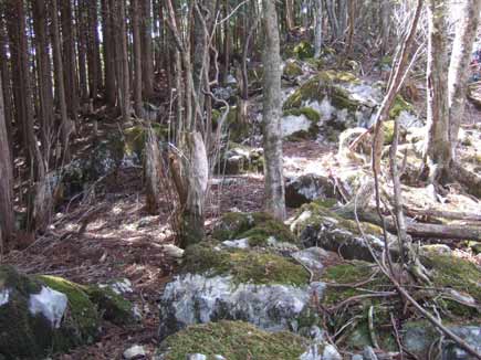 植林帯に沿って石灰岩の露出した上りになります。