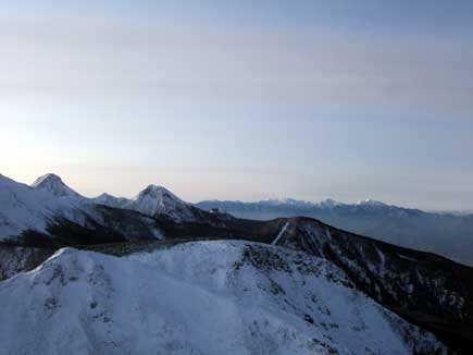 6時に朝食をいただき、6時40分冬山装備で出発します。ヒュッテからも天狗の山頂が見えましたが、中山峠まで来るとより厳しい姿です。山頂の雪が風に飛ばされているのがよく見え恐ろしく寒そうです。