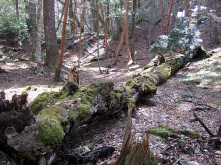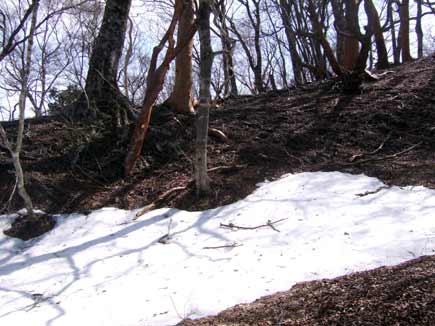 縦走路近くは自然林の美しいところ、残雪、巨木、倒木、枯葉、苔等にパワーをもらったり、安らぎをもらったり大好きな雰囲気です。ブナの大木が多いのもうれしいです。冬の眠りから目覚めた森は暖かい春の陽をふんだんに浴びて大きく伸びをして「ウゥ〜ン、気持ちいいね〜、もう起きようか〜」