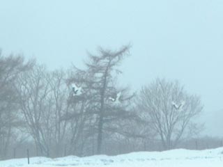 定期観光バス「ホワイトピリカ」で行った鶴見台にて 上の左の写真をアップにしただけの右の写真。 周りにもたくさんいるのだ。 ガイドさんによると合計70羽ぐらいいたらしい。 左は今回の旅行(流氷一人旅)のベストショットかな? カメラをかまえたらちょうどこっちに向かって飛んできた。 偶然の産物・・・・。 鶴見台はもともと、一人のおばあさんが自腹で餌付けを していた場所。 今では国の丹頂保護政策により、餌代は国家予算。 |