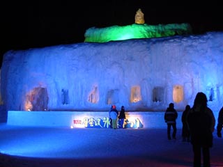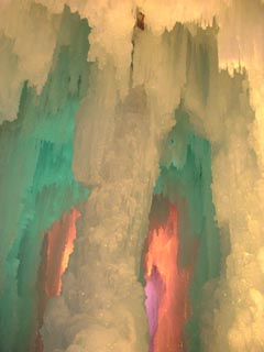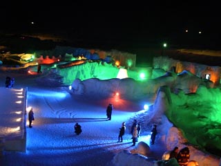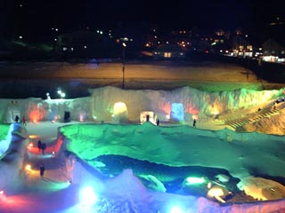 | 氷瀑まつり会場の中央にあるステージ。中にはいると右の写真のように大きなつらら?が至る所にぶら下がっています。 白い氷に色とりどりのライトが当てられ、とても幻想的。 |