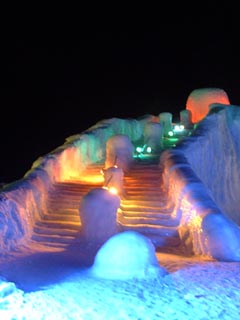 | 上の写真の中央ステージの左側には階段が設置されて おり、上の方に登ることもできます。 で、登るときに使用する階段が⇒ もちろん氷でできており、足下はツルツル。 手すりもありますが、コレも氷で固定されています。 もちろん、僕がコレを登り、高いところへ行くには、 それ相応の「勇気」が必要です。 一緒に行ったKさんはすいすい登ってましたが・・・・。 めっちゃへっぴり腰で登ってました。 |
