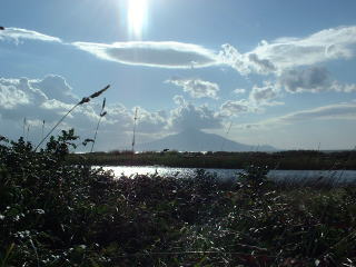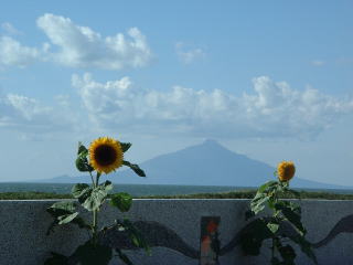 | 上:こうほねの家から ヒオウギアヤメが有名なこうほね沼。 もちろん、時期が違うので咲いていません。 右上:サロベツ駐車公園のひまわりと利尻 ちょうどひまわりが咲いていました。 '01秋の北海道一人旅 右:道道106号線の途中から夕日。 親との旅行中です。 |