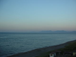 ピラミッド状の建物が目を引くフレトイ展望台。 左は網走方面、上が知床方面 ここから見る海が冬には流氷に覆われ、 流氷の鳴き声と共に旅人に迫る。 |