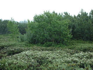 | 台風が接近中で、めちゃくちゃな大雨になっていたので散策はあきらめました。 左の写真には雨が映りこんでいますね(^^; 白く見えるのがつつじの花なんだけど、それより雨が目立ちます(笑) |