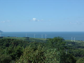 留萌の市街と天売・焼尻島が望める高台。 なかなかいい眺めですね。 島はほとんど影の状態でしか映ってないけど(笑) 左は留萌市街の南側にある風車群。 |